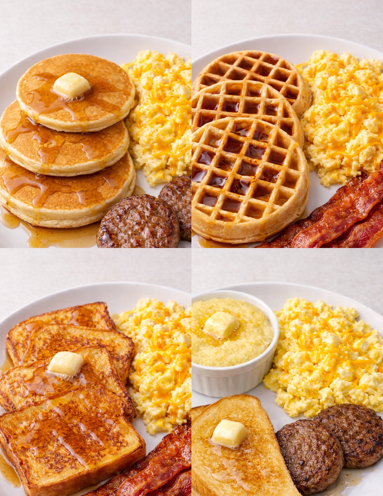or pork sausage, crispy bacon, and creamy cheese grits, ensuring a satisfying
